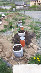 Zona va fi alcătuită din plante perene, flori și arbuști. Deocamdată ceva busuioc și lavandă (abea răsărite), precum și alte câteva plante, încă nerăsărite. Din cauza substratului total necorespunzător (argilă galbenă) am plantat deocamdată în recipiente de plastic, urmând să nivelez spațiul cu pământ de umplutură.