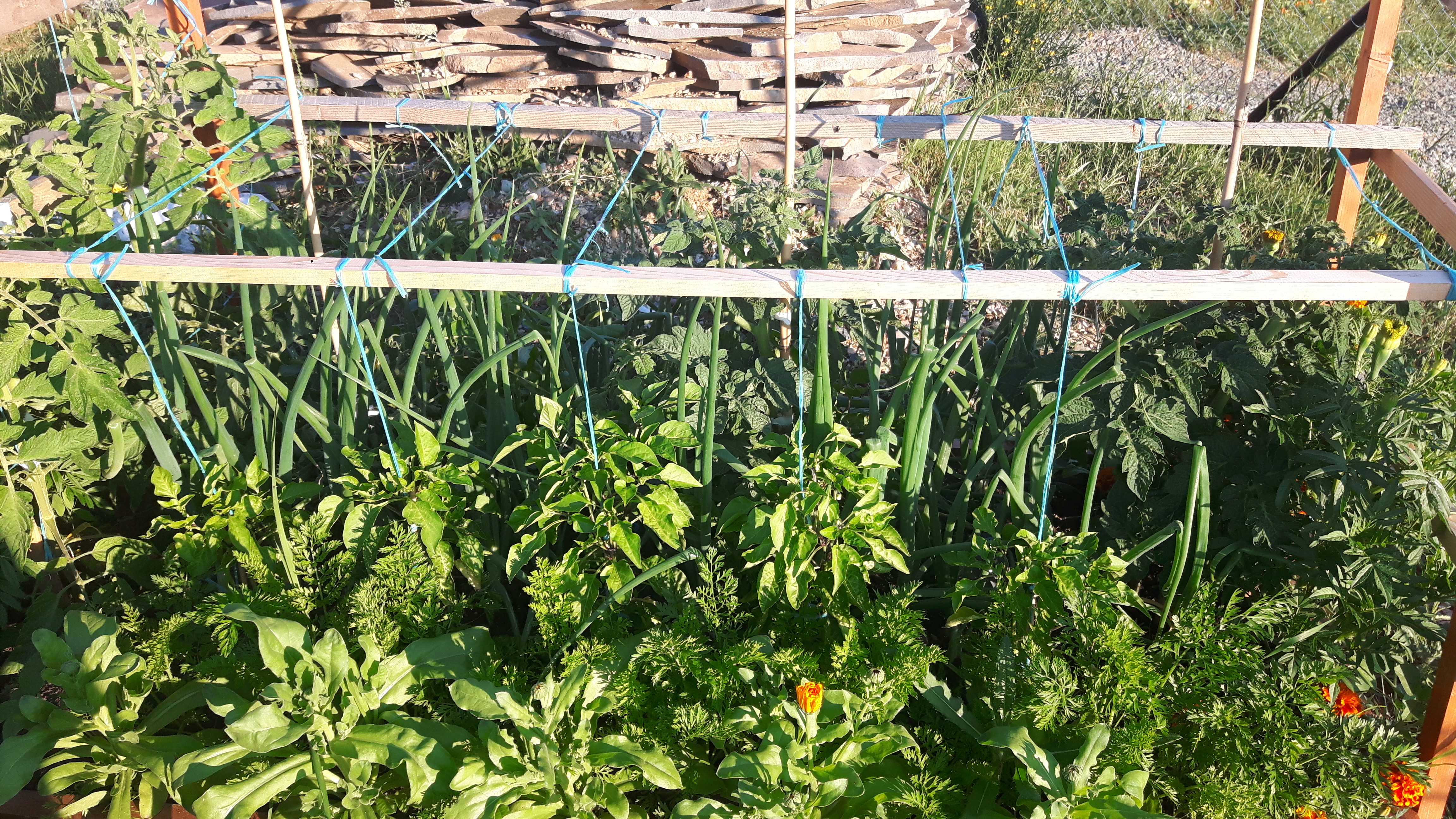 Roșiile sunt serios concurate de celelalte plante. Morcovii, ardeii (se văd foarte bine, sunt pe cale de a înflori), ceapa și usturoiul au crescut foarte bine.