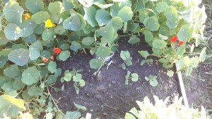 Deocamdată zucchini din centrul patului de legume sunt mici, iar călțunașii și gălbenelele le fac o concurență serioasă.