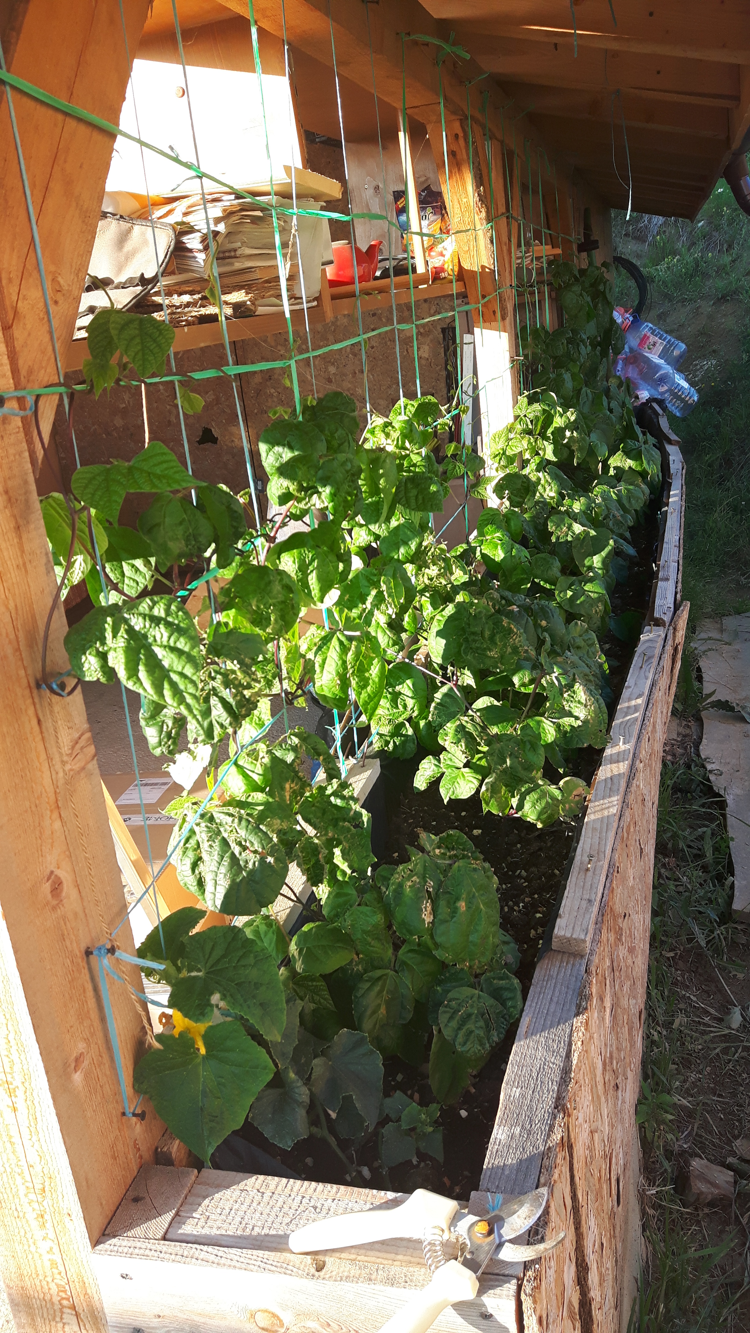 Fasolea are și rol decorativ, de aceea forțez ca vrejii să acopere întreg spațiul creat de către suporți.