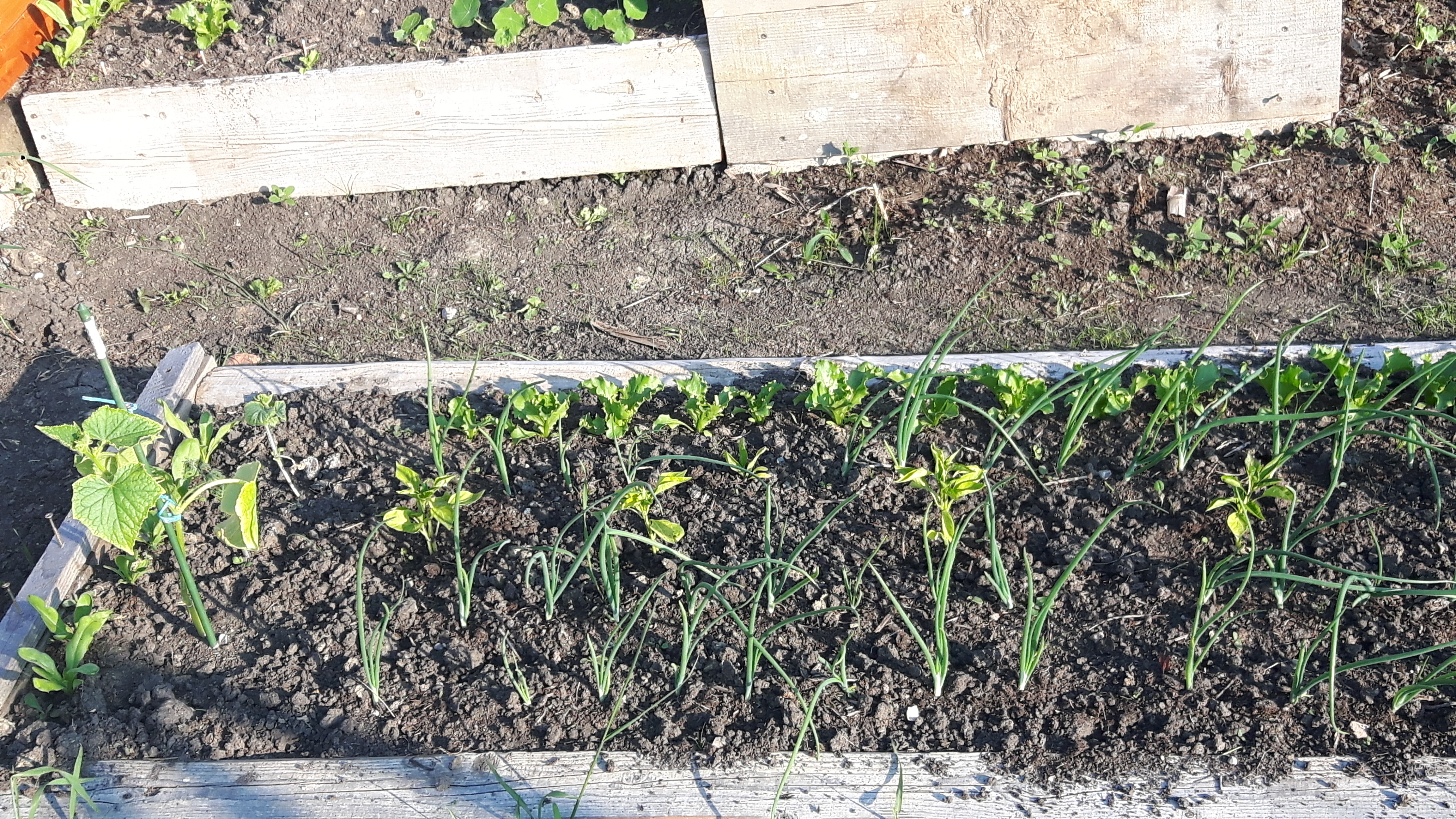 Un alt pat creat în luna mai: castraveți și gălbenele la unul din capetele înguste, crăițe la celălat capăt îngust; pe laturile lungi salată și ceapă de diferite soiuri. La mijloc – ardei gras.