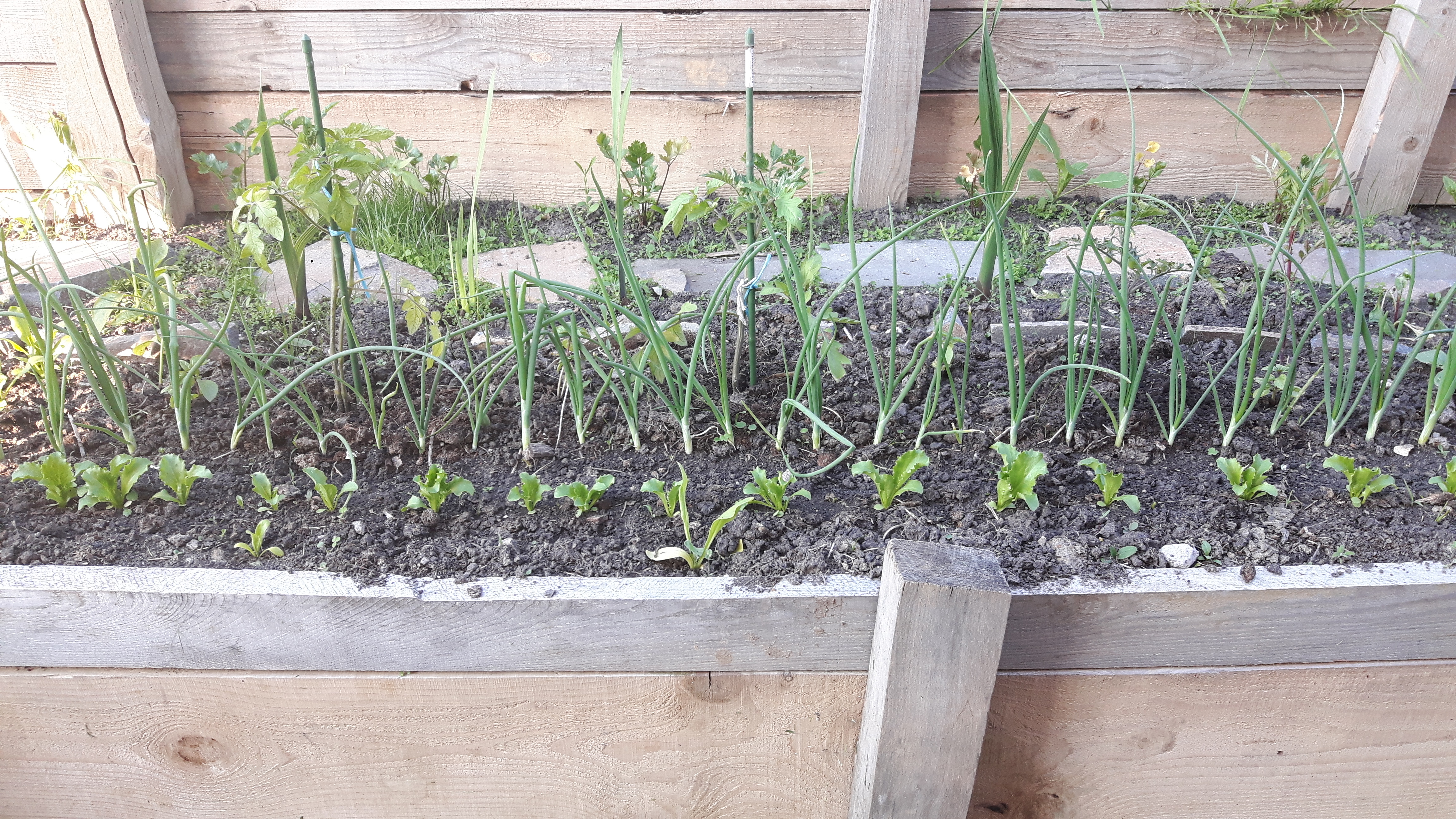 roșii, ceapă, gălbenele, salată. Mai în spate, gladiole.