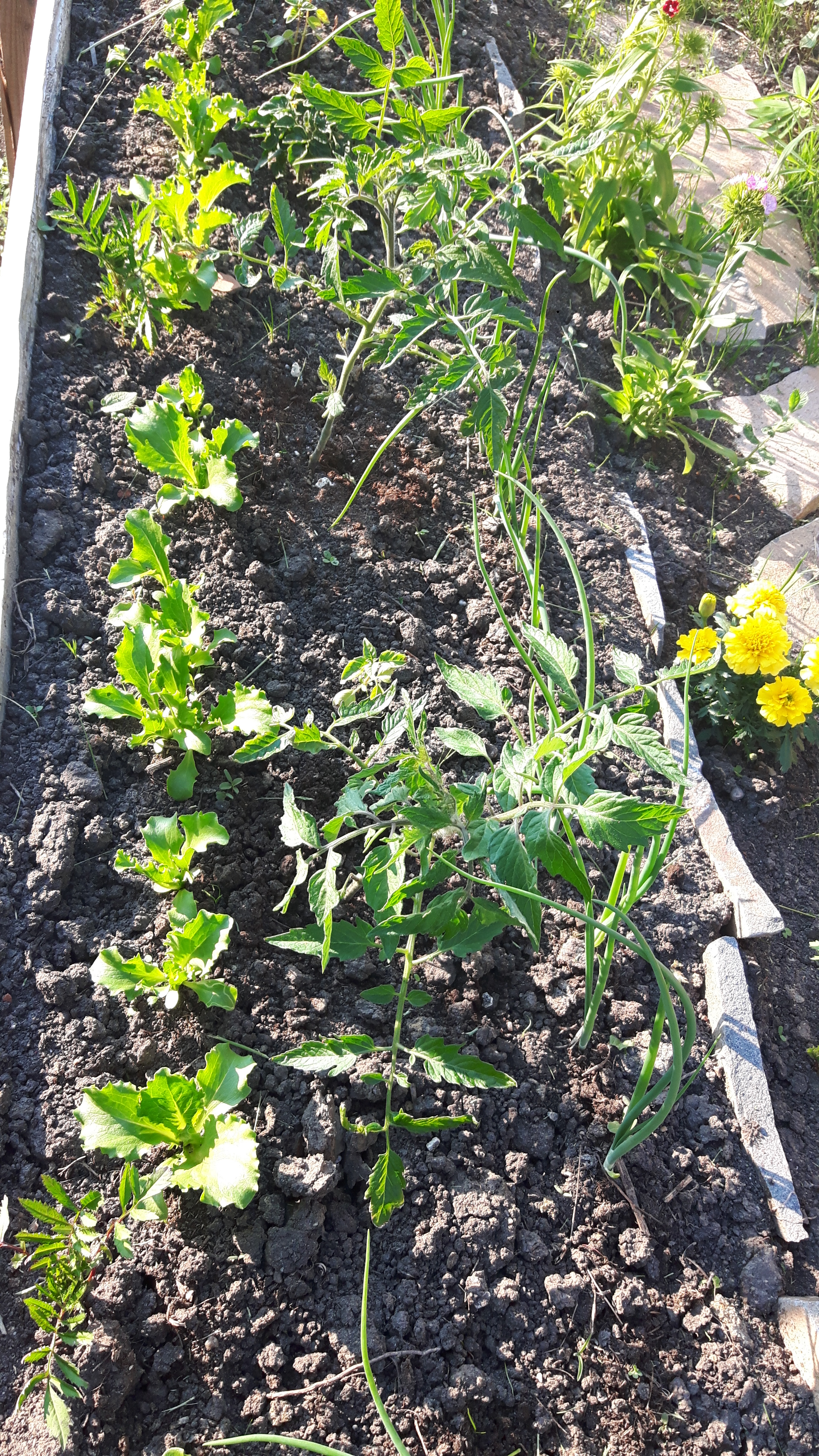 Tomate și busuioc, ceapă li salată; gălbenele intercalate. Lângă bordură, garoafe japoneze și crăițe.