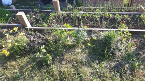 Margarete (galbene și albe), lavandă și trandafiri, împreună cu mult lupin.