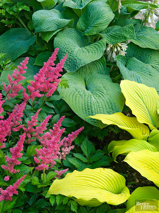 În zonele umbrite ale grădinii, folosiți plante cu foliaj contrastant (mai sus, hostas cu verdele ei, combinată cu florile roșiatice de astilbe și foliajul mai deschis al unei chartreuse)