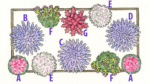Am găsit pe net și planul de mai sus: un pat ridicat, dedicat lavandei, unde: A: cimbru târâtor; B: lavandă Sharon Roberts; C: lavandă Vera; D: lavandă Royal Velvet; E: cimbru englezesc (cel obișnuit…); F: oregano Amethyst Falls; G: Agastache cana Rosita. Planul se potrivește mai degrabă pentru Dobrogea decât pentru Ardeal, cere plante mari iubitoare de căldură, dar calul de dar nu se caută la dinți…