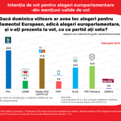 Sondaj INSCOP Research, realizat în perioada 5 – 13 martie 2019. Nici acest sondaj nu prinde intrarea lui Rareș Bogdan în cursa electorală. În ceea ce privește prezența efectivă la urne în ziua alegerilor, Inscop Research a realizat o estimare pe baza unei întrebări dedicate (Pe o scală de la 1 la 10 în care […]