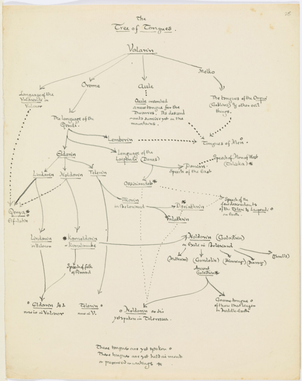 “The Tree of Tongues” (1930-7) A professional philologist, Tolkien used his expertise to trace the many inter-related Elvish languages in this chart. It shows that each subsesquent language was derived from Valarin, the language of the Gods.