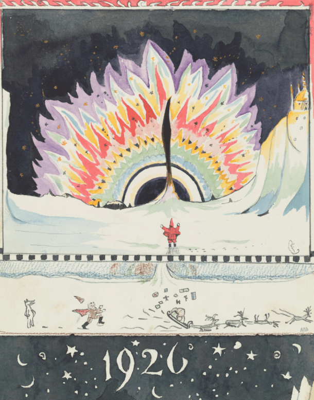 “Drawing by Father Christmas of the Aurora Borealis” (1926) This illustration from 1926 (when his sons were aged nine, six and two – his daughter, Priscilla, was born in 1929) shows what happened when the North Polar Bear accidentally caused “the most monstrous firework there ever has been” and “turned on all the Northern Lights for two years in one go.”